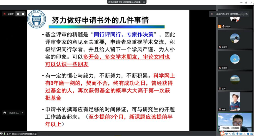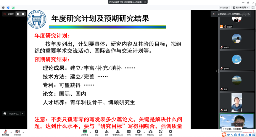 2022年11月17日下午,公司召开了国家自然科学基金线上辅导会。此次辅导会特邀北京科技大学王宇教授进行基金申报辅导。会议由副经理裘娜主持,全体教师参会并听取专家意见。