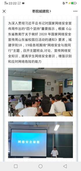 网络安全宣传周活动期间,公司积极开展线上、线下相关活动,不断强化主题宣传教育。9月16日,公司组织各班级开展了“网络安全与我同行”主题班会,通过学习相关材料,同学们了学习到了更多有关网络安全方面的内容。通过班会的学习、讨论之后,各班组织了同学们参加全民网络安全知识竞赛,激发同学们学习网络安全知识的兴趣,提升网络安全防护技能,增强安全防范意识,提高识别和应对网络危险的能力。通过公司官方微信、网站等新媒体推送网络安全知识,引导公司师生正确使用网络,提高网络道德观和法制观。多种形式广泛宣传个人网络信息保护、电信诈骗、网络暴力、网络法律维权等安全知识。