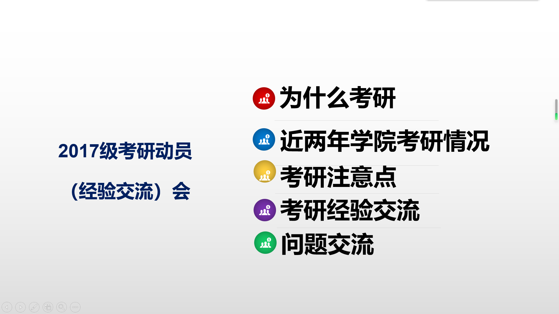 会议首先由建筑工程教研室主任秦敬平老师从“为什么考研”、“考研难不难”、“考研注意点”等方面进行讲解和动员。土木工程专业负责人孙启林老师对近几年公司的考研情况进行介绍,并针对往年存在的问题进行重点分析。徐鸿飞老师针对第一届道桥方向毕业生考研方向进行了解析并提出建议。
