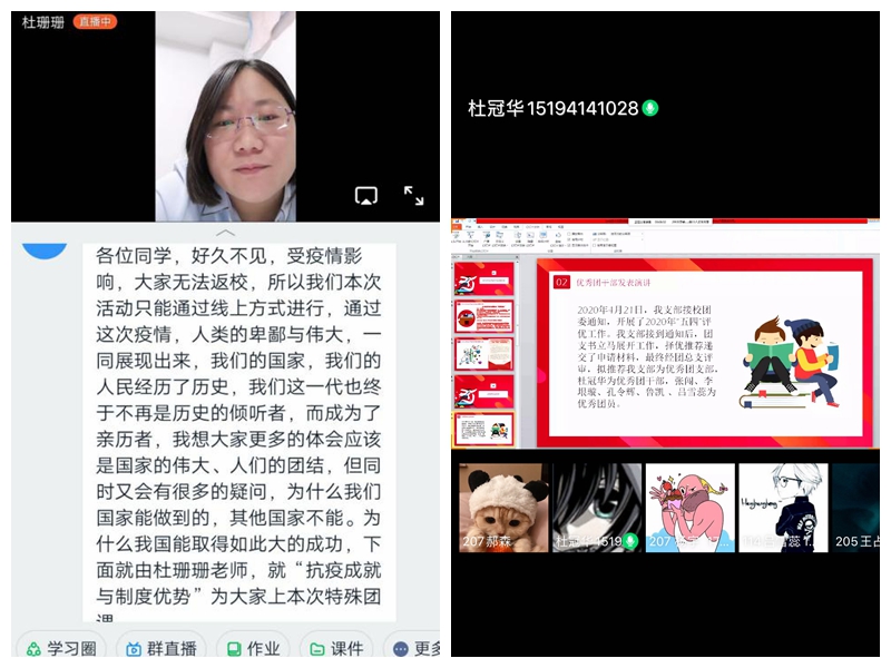 为确保全面准确做到“五个讲清楚”,保证思想引领作用落到实处,引导青年员工进一步坚定制度自信,团总支副书记杜珊珊利用钉钉为公司员工会干部、各班团支部书记围绕抗疫成就与制度优势开展网上团课;在认真完成青年大学习集中学习的基础上,又结合公司工作实际与专业倾向,各团支部书记组织召开网上主题团日活动;各团支部在五四评优中获得“优秀团干”称号、被评为青春战“疫”优秀青年志愿者的同学也通过钉钉或QQ群开展宣讲报告、故事分享等学习宣传活动,向大家分享自己的心得;利用“枣院城建院”微信公众平台,开展网络知识竞赛,以此夯实同学们思想基础建设,提升理论学习的思想性、亲和力和渗透度;向全体同学发出倡议“呼吁同学们加入到志愿者的行列中来,持续深入开展疫情防控志愿服务工作”,在做好自身安全防护的前提下,依法科学有序参与疫情联防联控,为坚决遏制疫情扩散、夺取防控斗争胜利贡献青春力量;结合疫情防控实际推荐优秀抗疫志愿者作为入党积极分子候选人。