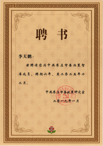近日,伟德国际1946李天鹏博士被中共枣庄市委政策研究室聘请为中共枣庄市委决策智库成员,聘期为2019.01-2025.12。受聘后,李天鹏博士将充分发挥自身专业背景和技术优势,主动当好政府部门的参谋和助手。 枣庄市委决策智库成员受委托就我市创新转型持续发展重大政策和重点项目建设等事项提出对策、意见和建议;应邀开展调查研究、专题研讨、专题讲座、决策咨询等活动,为市委决策提供科学依据;按照本人专业所长,结合枣庄实际,开展调查研究,为全市经济社会发展建言献策等。