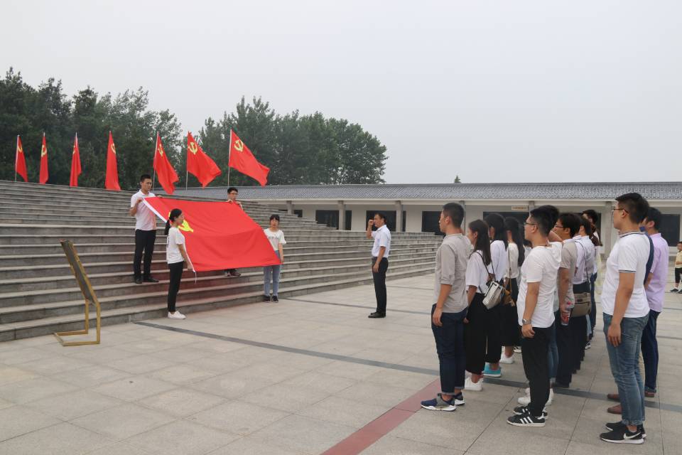 全体党员在烈士纪念碑下,面向党旗庄严宣誓,重温入党誓词,缅怀英烈伟业,不忘入党初心。