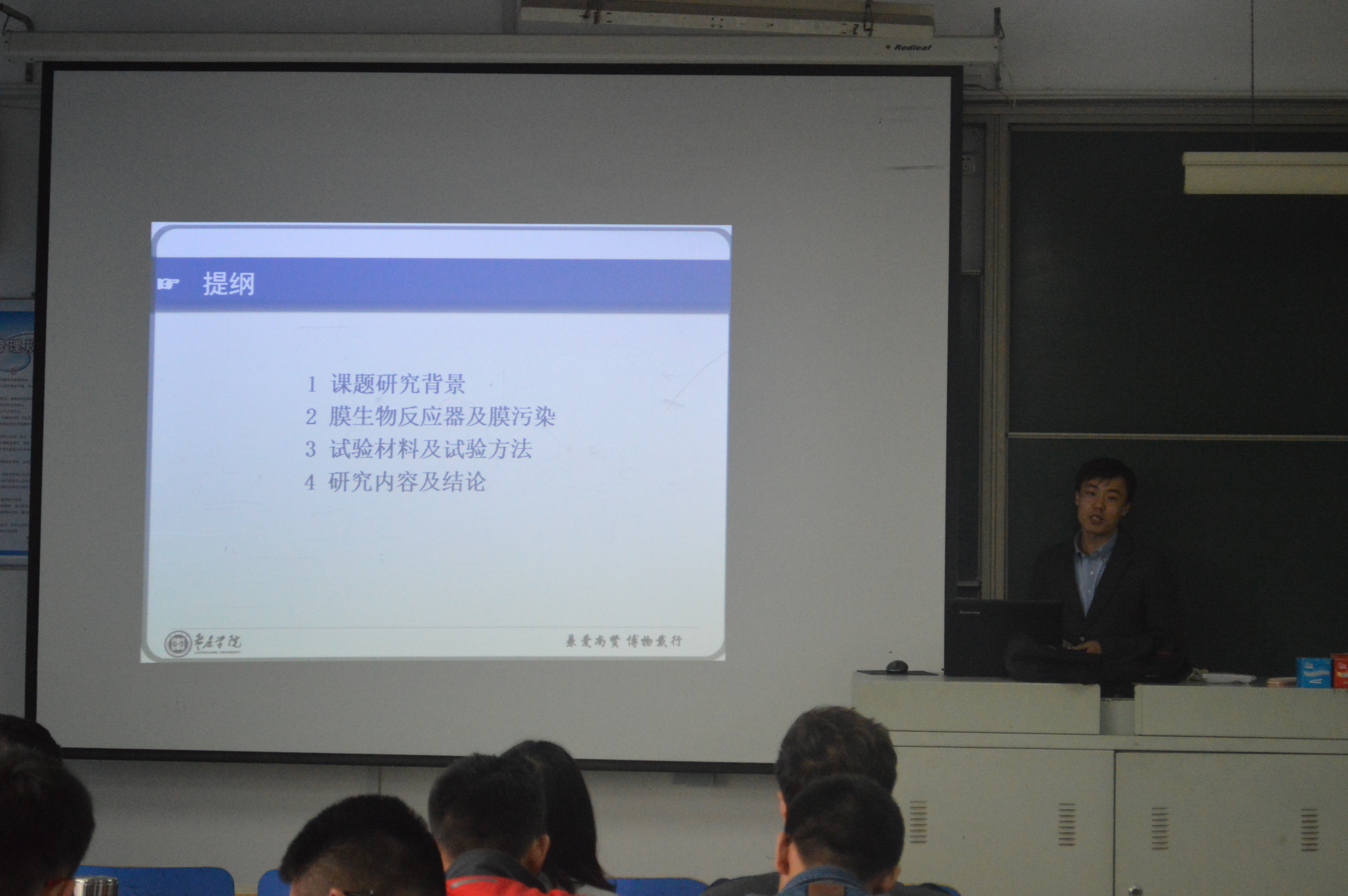 报告会上,刘彬首先通过播放图片及视频,介绍了以后置反硝化膜生物反应器处理模拟的生活污水为主体,通过实验改变进入厌氧池与缺氧池进水流量分配比来考察其污水处理效能,确定最优脱氮除磷运行工况。随后,通过短期优化氯化铁混凝剂投加量试验来考查系统混凝除磷率的变化和污泥的可滤性与污染潜质。又针对膜反应器的膜污染预测问题,建立传统BP神经网络膜污染预测模型和经PSO优化的BP神经网络膜污染预测模型,分析讨论模型结构及参数的选取与确定。报告深入浅出,主题鲜明、视野开阔,得到了在场师生一致好评。