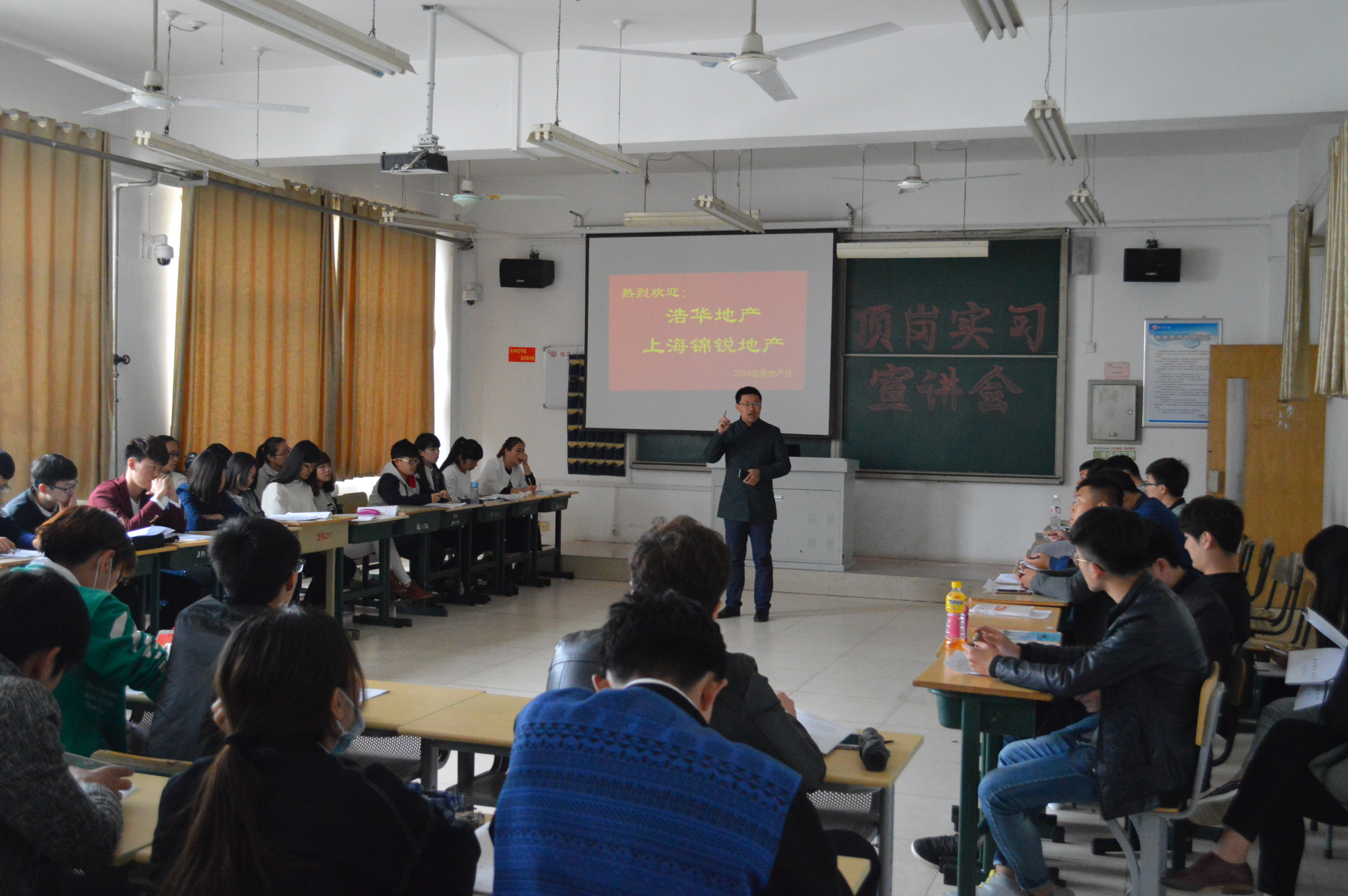 随后,上海锦锐地产和济南浩华地产公司进行了现场双选活动,上海锦鋭地产公司副总裁厉娜和浩华地产公司人事招聘专员薛淑娟分别就公司企业文化、实习生活环境、员工在公司成长路径等方面和同学们做了充分的交流。员工现场互动热烈,经双向选择,2014级房地产专业的员工全部落实了实习岗位。