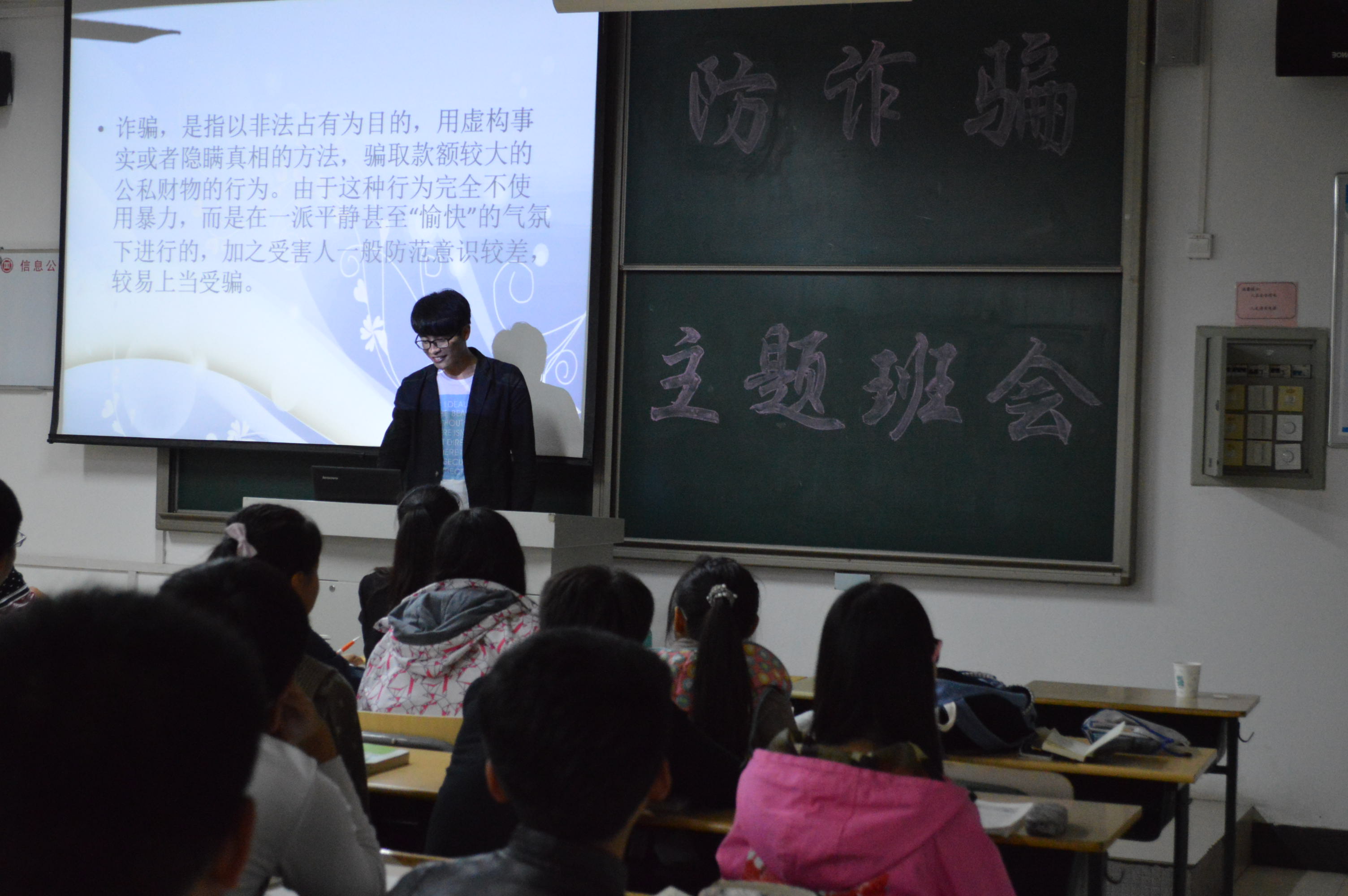 关注自身,财产安全,构建和谐校园。10月23日晚,14级土木工程一、二班分别在理工楼2516、2517举办以“预防诈骗”为主题的班会,班会由助理导员张宇颖,潘国栋主持,14级土木工程全体员工参加,辅导员李扬做了最后总结.