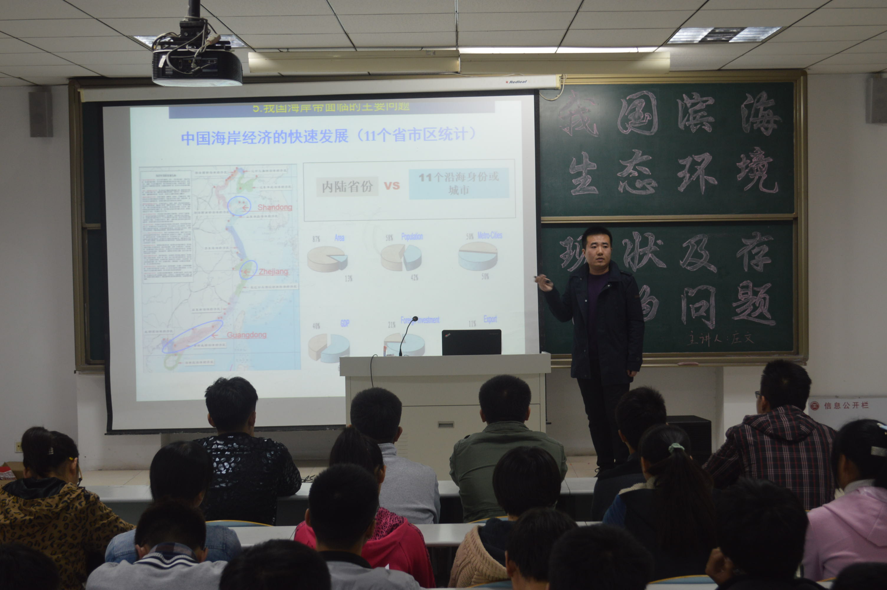 报告会上,庄文老师首先通过播放图片及视频,介绍了滨海海域目前存在的环境现状及问题,指出当前生态系统所面临的巨大挑战。针对当前滨海海域环境状况与未来发展态势,提出了解决问题的方案:限制“双高”产业的发展,控制污染物新增量;抓好城市污水处理及其管网建设与运行;加强污染减排的法规建设和监控协调机制等等。接着,就当前世界海洋环境问题为大家讲述专业的环保知识,要求同学们进一步加强专业理论知识的学习,增强环境保护意识。庄老师的报告深入浅出,精彩纷呈,博得了在场师生的热烈掌声。
