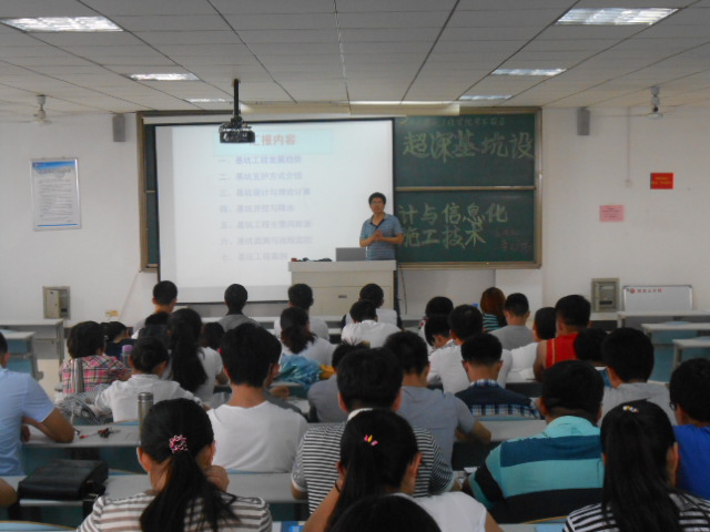 超深基坑工程是一个集挡土、支护、防水、降水、挖土等环节构成的一个系统工程,其中某一环节的失误将会带来整个系统的事故。仅依靠理论分析和经验估计难以把握在复杂的开挖和降雨等条件下基坑支护结构与土体的变形破坏,采用信息化施工和监测技术可以把深基坑事故发生的概率降至最低, 使得设计施工达到安全、经济、合理的要求。李老师通过PPT课件,以深厚的理论功底和丰富的实践经验,结合大量的相关案例对超深基坑设计与信息化施工的技术问题进行介绍,包括超深基坑的设计、工程施工的信息化、监测手段及信息采集、数据处理技术、安全指标体系与安全性评价、超深基坑工程紧急预案、超深基坑工程应用实例等内容,让同学们有了更加全面深入的了解。