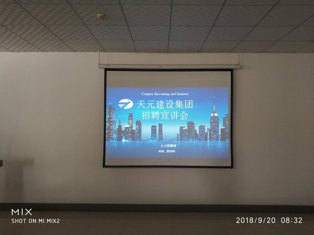 会议开始,由公司就业指导老师致辞,并对目前毕业生面临的就业环境做了简要说明,阐明了招聘会的优势以及进入事业单位的好处。随后,招聘会负责人高经理以ppt的形式就公司的注册地址,规章制度,企业文化,现有资质认证,仪器设备,组织构架,人力资源政策等多个方面向同学们做了简单介绍,并就实习期员工的福利待遇做了明确解释。本次公司招聘主招土木工程、工程管理、给排水工程等专业人员。其后,高经理对公司的细节进行了更为精细的阐述。最后,同学们积极踊跃的提出自己的问题与疑惑,招聘会负责人耐心的进行现场解答,并对同学们进行了应聘的利弊分析。企业方表示真诚的邀请同学们加入天元,实现自己的梦想!